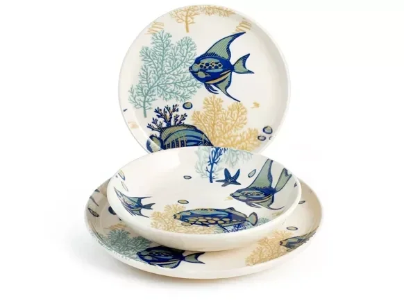 Présentant de magnifiques poissons dans les tons turquoise et bleu nageant dans une mer de coraux bleu clair, bleus et beiges, ce service de table ajoute une touche de charme exotique, transmettant l'atmosphère détendue et vibrante des plages des Caraïbes.