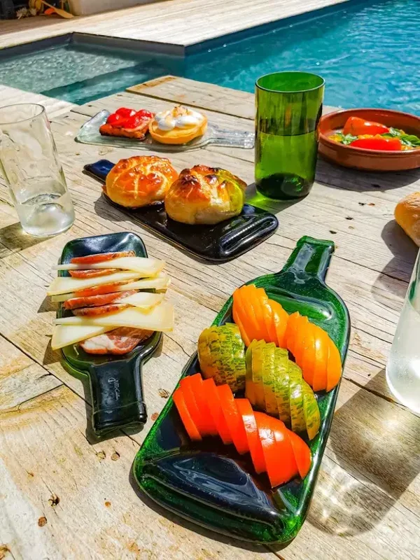 Et on en a fait  un PLAT ! des bouteilles fondues et aplaties qui revivent en guise de plateaux pour des présentations culinaires chics et originales et des apéros écolos