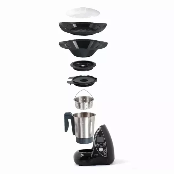 • Accessoires inclus : fouet, plateau vapeur à 2 étages avec couvercle, panier cuisson en acier inoxydable, spatule, mélangeur, livre de recettes