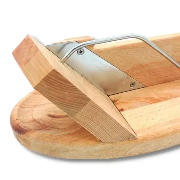 La planche et le manche sont en bois de hêtre huilé. Le hêtre est un bois solide et particulièrement résistant ce qui en fait le matériau idéal pour ce modèle de coupe saucisson. D’un point de vue esthétique, sa couleur est claire avec des nuances de blanc et rose.