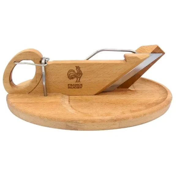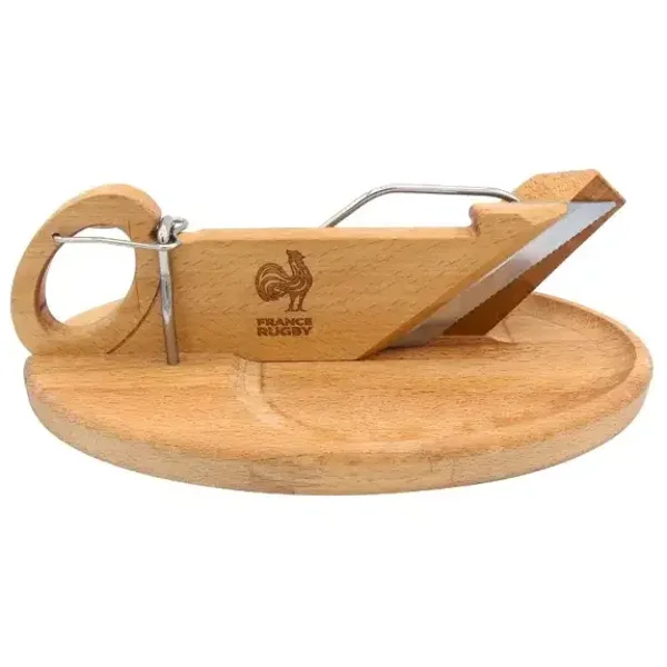 La guillotine à saucisson France Rugby x Ovalie a été imaginée avec un design 100% rugby pour les apéros partagés entre supporters.