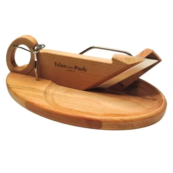 La planche et le manche sont en bois de hêtre huilé. Le hêtre est un bois solide et particulièrement résistant ce qui en fait le matériau idéal pour ce modèle de coupe saucisson. D’un point de vue esthétique, sa couleur est claire avec des nuances de blanc et rose.