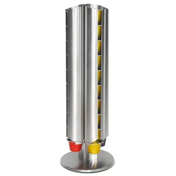 Structure en acier inoxydable avec base tournante, peut contenir 40 capsules type Nespresso.