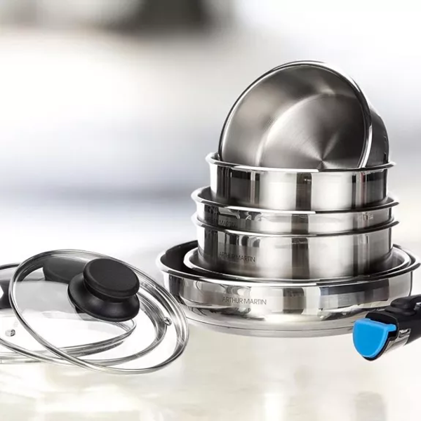 La batterie de cuisine Arthur Martin 10 pièces comprend 3 poêles, 3 casseroles en inox, 3 couvercles en verre et une poignée amovible. Conçue pour s’adapter à tous les types de cuisson, elle garantit une répartition homogène de la chaleur et un rangement optimisé.