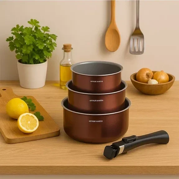 Le set de casseroles Arthur Martin avec poignée amovible allie performance, élégance et praticité. Parfaitement adaptées à toutes les cuisines, elles offrent un excellent compromis entre design moderne et qualité durable. Simplifiez votre quotidien tout en cuisinant avec style !