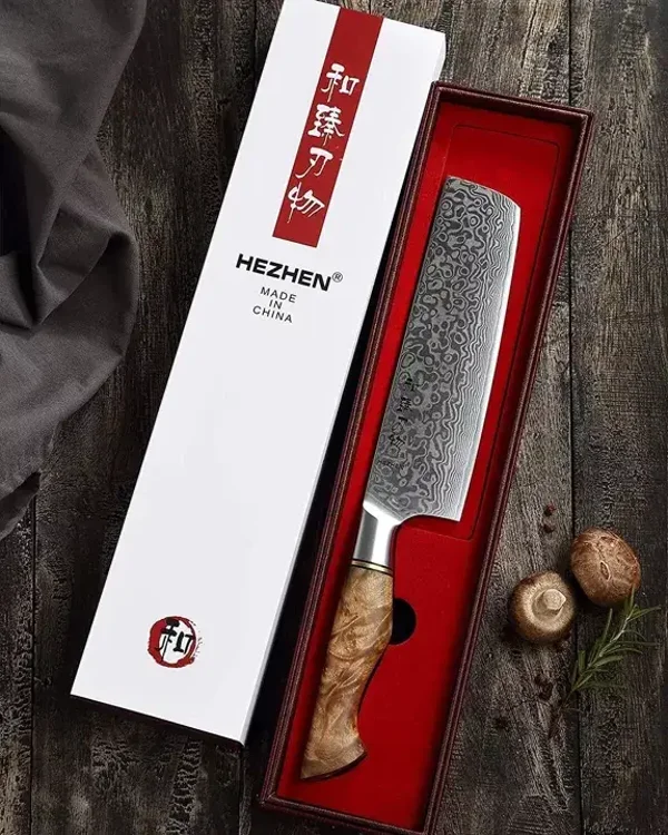 Couteau à découper Nakiri tranchant comme un rasoir forgé en acier Damas de la série HEZHEN B30. Le couteau a une lame de 18,0 cm avec une dureté de 59 à 61 HRC. Le manche est en bois de platane (bois de sycomore) : une essence de bois particulièrement dure d'origine américaine. Le couteau à découper Nakiri a un bon équilibre, tient confortablement dans la main avec une poignée ergonomique. En bref, un couteau à découper Nakiri sur mesure issu d'une luxueuse série de couteaux de fabrication japonaise.