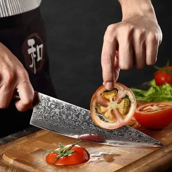 Un couteau de chef tranchant comme un rasoir forgé en acier Damas de la série HEZHEN B30. Le couteau a une lame de 21,0 cm avec une dureté de 59 à 61 HRC. Le manche est en bois de platane (bois de sycomore) : une essence de bois particulièrement dure d'origine américaine. Le couteau de chef est bien équilibré, tient confortablement dans la main et possède une poignée ergonomique. Bref, un couteau de chef sur mesure issu d'une luxueuse série de couteaux de fabrication artisanale japonaise.