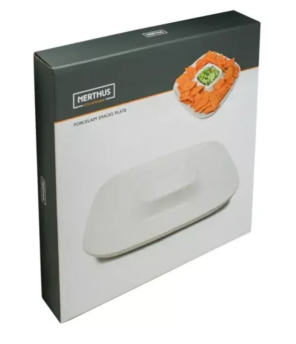 Assiette snacks ronde en porcelaine pour apéritif avec récipient central à sauce.