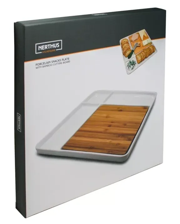 Assiette snacks / Bois porcelaine pour snacks avec planche à découper intégrée en bambou parfaite grâce à son matériau antibactérien naturel et garantit la conservation correcte du tranchant de la lame du couteau.