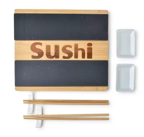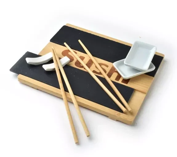 Produit vendu en coffret : 2 jeux de baguettes, 2 bols, planche en bois, planche en ardoise, 2 repose-baguettes.