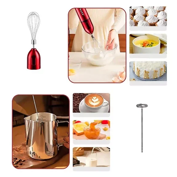 • Ce robot culinaire 5 en 1 comprend un mixeur, un bol hachoir de 600 ml, une tasse à mesurer de 700 ml, un batteur à œufs et un mousseur à lait.