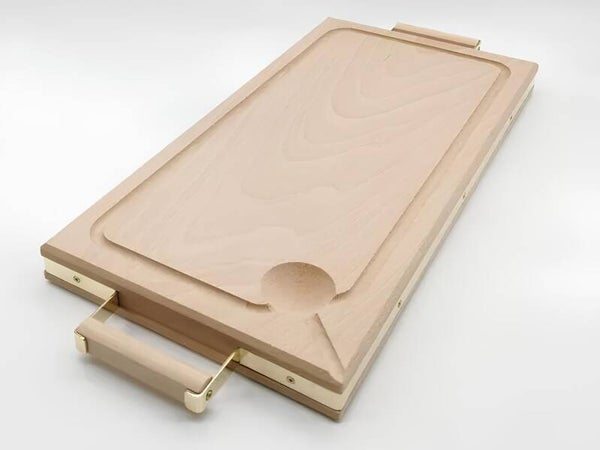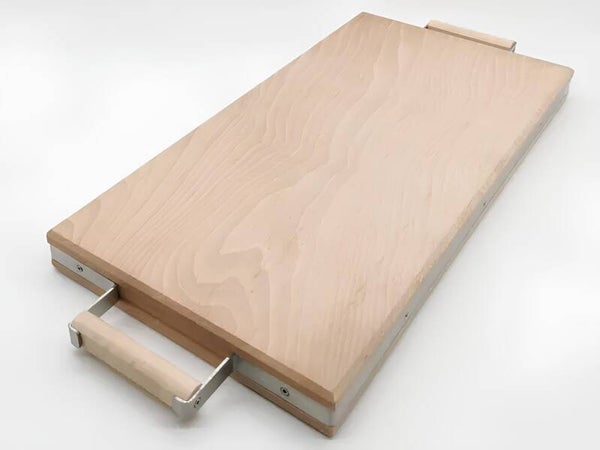 Planche en bois, avec cerclage métallique et poignées. Plateau en hêtre français, d'une seule pièce sans colle.