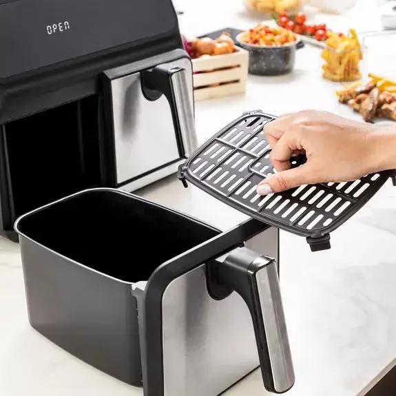 • InnovaGoods vous vient en aide pour cuisiner de manière simple et amusante en vous proposant les meilleures nouveautés pour votre cuisine, comme Friteuse sans huile InnovaGoods Fryinn Double 8000 Noir Inox 3400 W 8 L ! ¡Découvrez une large gamme de produits de qualité qui se démarquent par leur fonctionnalité, leur efficacité et leur design innovant !Nos friteuses à air offrent une nouvelle façon saine de préparer de délicieuses recettes. Grâce à ses puissants ventilateurs, l'air chaud à 360° à circulation rapide cuit plus efficacement que les appareils conventionnels. La friteuse sans huile de 3400 W dotée de 2 paniers de 4 L chacun permet de cuisiner 2 plats différents simultanément en un temps record. Il est facile à nettoyer et dispose d'une protection contre la surchauffe. Facile à utiliser : choisissez parmi ses 10 programmes sur son écran tactile numérique, réglez la température et la durée, et faites frire, rôtir, griller, cuire au four, déshydrater, décongeler, griller ou réchauffer. Cuisinez avec 95 % de matières grasses en moins, des aliments délicieux et sains avec jusqu'à 80 % de calories en moins. Comprend un aimant QR avec un livre de recettes en ligne avec plus de 100 recettes dans différentes langues. Moderne et polyvalente : Notre friteuse dispose de 2 paniers indépendants d'une capacité chacun de 4 L, permettant 2 zones de cuisson séparées pour différentes recettes. De plus, ses 3400 W de puissance vous permettent de cuisiner de délicieux plats. Débit d'air à 360° : la technologie de circulation d'air chaud à 360° permet à la friteuse à air de cuire rapidement, économisant ainsi de l'énergie et jusqu'à 66 % de temps. Le panier percé favorise la circulation de l'air à l'intérieur, garantissant une cuisson uniforme afin que vous puissiez déguster des aliments croustillants à l'extérieur et tendres à l'intérieur. Haute qualité : la friteuse dispose de 2 paniers amovibles conçus avec une technologie avancée et fabriqués avec un matériau antiadhésif qui empêche les aliments de coller et permet une répartition uniforme du flux d'air. Nettoyage et entretien : Certaines recettes nécessitent l'utilisation de récipients adaptés à la friteuse, de préférence en silicone. Pour éviter d'endommager le revêtement antiadhésif du panier, il est recommandé de ne pas utiliser de récipients métalliques ou de produits de nettoyage abrasifs. Le panier amovible passe au lave-vaisselle. Matériau : Acier inoxydable Polypropylène Sans BPA Couleur : Noir Argent Type : Friteuse sans huile Capacité : 8 L Minuterie : 60 min Débit d'air : 360º Comprend : Livre de recettes Friteuse à air : Cuisson rapide sans graisse Écologique : Économie d'énergie Multifonction : 10 programmes Température réglable : 60-200 ºC Propriétés : Antiadhésif Nettoyage facile : Va au lave-vaisselle Type de fiche : F Longueur du câble : 75 cm Puissance : 3400 W AC Entrée : 220-240 V / 60 Hz Mesures env.:37,5 x 31,5 x 38 cm Emballage et manuel en 24 langues : anglais, français, espagnol, allemand, italien